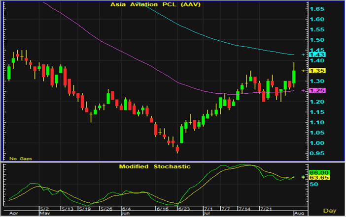 ราคาหุ้น AAV มีสัญญาณซื้อทางเทคนิคเกิดขึ้นในการซื้อขายสัปดาห์ที่ผ่านมา และยังมีแนวโน้มที่จะปรับตัวขึ้นต่อ หากในระหว่างวันปรับตัวลงเข้าใกล้แนวรับ 1.32-1.33 บาท แนะนำเปิดสถานะซื้อ และมีจุดขายตัดขาดทุนอยู่ที่ 1.3 บาท