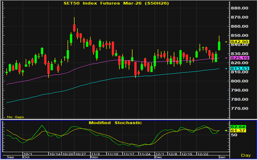 ดัชนีตลาดหุ้นไทยวานนี้ปิดตลาดเพิ่มขึ้นในปริมาณมาก หุ้น DELTA ดีดตัวขึ้นตามหุ้นเทคโนโลยีในต่างประเทศปรับตัวเพิ่มขึ้นในปริมาณมาก ขณะที่มีแรงซื้อเก็งกำไรหุ้นกลุ่มสื่อสารรวมทั้งกลุ่มที่คาดว่าจะมีผลประกอบการดีกลับเข้ามา ส่วนปัญหาทางภูมิรัฐศาสตร์หลังสหรัฐเข้าไปควบคุมการผลิตน้ำมันในเวเนซุเอลา และอาจส่งผลให้ราคาน้ำมันปรับตัวลง จนทำให้หุ้นกลุ่มที่ได้ประโยชน์เริ่มฟื้นตัว การเคลื่อนไหวของตลาดหุ้นไทยในภาพรวมเริ่มกลับมามีแนวโน้มฟื้นตัว แต่ในระยะสั้นอาจมีแรงขายทำกำไรกลับออกมาหลังดัชนีดีดตัวขึ้นมากในการซื้อขายวานนี้ การรายงานข้อมูลตลาดแรงงานของสหรัฐช่วงกลางและปลายสัปดาห์ เป็นประเด็นที่นักลงทุนให้ความสนใจ ส่วนการเก็งกำไรในสัญญาเดือน H แนะนำเปิดสถานะซื้อใกล้แนวรับบริเวณ 837-838 จุด และมีจุดขายตัดขาดทุนอยู่ที่ 835 จุด ส่วนแนวต้านสำหรับเก็งกำไรการอ่อนตัวในระหว่างวันมีแนวต้านสำหรับเปิดสถานะอยู่ที่บริเวณ 849-850 จุด และมีจุดปิดสถานะตัดขาดทุนอยู่ที่ 853 จุด