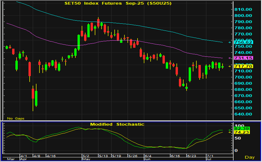 ดัชนีตลาดหุ้นไทยปรับตัวลงในช่วงเปิดตลาดภาคเช้า ก่อนที่จะมีแรงซื้อกลับเข้ามาจนทำให้ดัชนีดีดตัวลดช่วงการติดลบในระหว่างวันลง แต่ยังคงปิดตลาดปรับตัวลงจากระดับปิดของวันจันทร์ ปัญหาการค้าระหว่างสหรัฐและประเทศต่างๆเป็นประเด็นกดดันการลงทุน โดยในส่วนของไทยนั้น อัตราภาษีที่ถูกสหรัฐจัดเก็บเป็นระดับเดียวกับที่สหรัฐประกาศในเดือนเมษายน ประกอบกับยังมีเวลาก่อนที่จะจัดเก็บภาษีในอัตราใหม่ในเดือนสิงหาคม แรงกดดันต่อการลงทุนในระยะสั้นจึงมีไม่มาก อย่างไรก็ตามประเด็นดังกล่าวจะส่งผลให้นักลงทุนใช้ความระมัดระวังในการลงทุน การเคลื่อนไหวของตลาดหุ้นไทยจึงเป็นการแกว่งตัวแคบ หรือหากฟื้นตัวขึ้นก็จะมีกรอบค่อนข้างจำกัด การเก็งกำไรในสัญญาเดือน U แนะนำเปิดสถานะซื้อใกล้แนวรับ 711-712 จุด และมีจุดขายตัดขาดทุนอยู่ที่ 708 จุด โดยมีแนวต้านสำหรับเก็งกำไรฝั่งขายอยู่ที่บริเวณ 726-727 จุด และมีจุดปิดสถานะตัดขาดทุนอยู่ที่ 730 จุด