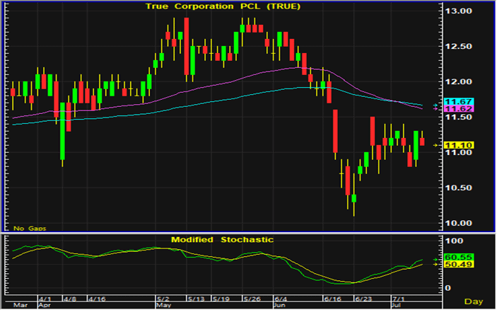 ราคาหุ้น TRUE อ่อนตัวลงในการซื้อขายวานนี้ แต่ยังไม่กลับลงไปต่ำกว่าจุดต่ำสุดของการซื้อขายวันจันทร์บริเวณ 10.8-10.9 บาท หากในระหว่างวันเคลื่อนไหวเหนือแนวรับนี้ แนะนำเปิดสถานะซื้อเก็งกำไร และมีจุดขายตัดขาดทุนอยู่ที่ 10.5 บาท