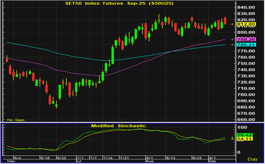 ดัชนีตลาดหุ้นไทยวานนี้ดีดตัวขึ้นช่วงเปิดตลาด ก่อนที่จะเริ่มอ่อนตัวลงในระหว่างวันและปิดตลาดปรับตัวลง หุ้นกลุ่มที่คาดว่าจะได้ประโยชน์จากมาตรการต่างๆที่รัฐบาลชุดใหม่เตรียมนำมาใช้ เป็นกลุ่มที่มีแรงซื้อเก็งกำไรเข้ามาอย่างต่อเนื่อง แต่ด้วยดัชนีตลาดหุ้นไทยซึ่งปรับตัวขึ้นมามากจึงเริ่มมีแรงขายทำกำไรกลับออกมา ประเด็นในประเทศทั้งรายชื่อคณะรัฐมนตรีชุดใหม่ มาตรการกระตุ้นเศรษฐกิจและนโยบายอื่นๆของรัฐบาล ยังเป็นประเด็นที่นักลงทุนให้ความสนใจ เช่นเดียวกับรายงานเงินเฟ้อของสหรัฐที่จะมีผลต่อการประเมินแนวโน้มดอกเบี้ยเป็นอีกหนึ่งปัจจัยที่จะส่งผลต่อการลงทุน ส่วนการเคลื่อนไหวของตลาดหุ้นไทยในระยะสั้นเริ่มมีสัญญาณเตือนการปรับฐาน หากดัชนีดีดตัวขึ้นในระหว่างวันควรระวังแรงขายที่คาดว่าจะมีกลับออกมา การเก็งกำไรในสัญญาเดือน U แนะนำรอเปิดสถานะซื้อใกล้แนวรับ   805-806 จุด และมีจุดขายตัดขาดทุนอยู่ที่ 803 จุด โดยมีแนวต้านสำหรับเก็งกำไรฝั่งขายอยู่ที่ 817-818 จุด และมีจุดปิดสถานะตัดขาดทุนอยู่ที่ 820 จุด