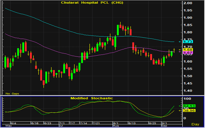 ราคาหุ้น CHG แกว่งตัวแคบในการซื้อขายวานนี้ แต่ด้วยสัญญาณซื้อที่เกิดขึ้นในสัปดาห์ก่อน คาดว่ายังมีแนวโน้มที่จะปรับตัวขึ้นต่อ โดยมีแนวรับสำหรับเก็งกำไรฝั่งซื้ออยู่ที่ 1.65-1.66 บาท และมีจุดขายตัดขาดทุนอยู่ที่บริเวณ 1.63 บาท