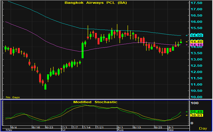 ราคาหุ้น BA เริ่มมีสัญญาณการฟื้นตัวทางเทคนิคเกิดขึ้นในสัปดาห์ก่อน และมีแนวโน้มที่จะปรับตัวขึ้นได้ต่อในสัปดาห์นี้ การเก็งกำไรระยะสั้นแนะนำเปิดสถานะซื้อใกล้แนวรับ 14-14.1 บาท และมีจุดขายตัดขาดทุนอยู่ที่ 13.8 บาท