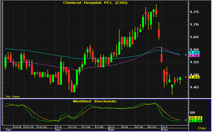 ราคาหุ้น CHG ปรับตัวลงมามากก่อนที่จะเริ่มแกว่งตัวแคบในการซื้อขายช่วงต้นสัปดาห์ การเคลื่อนไหวทางเทคนิคในระยะสั้นมีแนวโน้มฟื้นตัว และสามารถเปิดสถานะซื้อใกล้แนวรับ 1.46-1.47 บาท โดยมีจุดขายตัดขาดทุนอยู่ที่ 1.43 บาท