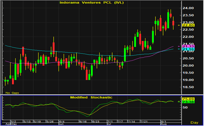 ราคาหุ้น IVL อ่อนตัวลงมาเคลื่อนไหวใกล้แนวรับสำคัญทางเทคนิคบริเวณ 22.5-22.6 บาท หากในระหว่างวันไม่กลับลงไปต่ำกว่าแนวรับนี้ แนะนำเปิดสถานะซื้อเก็งกำไร และมีจุดขายตัดขาดทุนอยู่ที่ 22 บาท