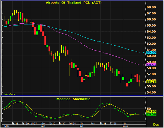 ราคาหุ้น AOT ทรงตัวเหนือแนวรับซึ่งเป็นจุดต่ำสุดของสัปดาห์ก่อนบริเวณ 55-55.25 บาท หากยังยืนเหนือแนวรับนี้ คาดว่าจะมีการดีดตัวทางเทคนิคเกิดขึ้น การเก็งกำไรระยะสั้นแนะนำเปิดสถานะซื้อใกล้แนวรับดังกล่าว และมีจุดขายตัดขาดทุนอยู่ที่ 54.75 บาท