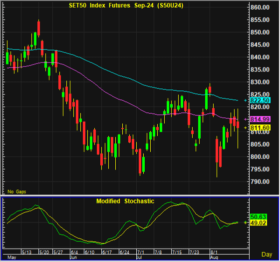 ดัชนีตลาดหุ้นไทยภาคเช้าแกว่งตัวในแดนบวก ก่อนที่ในภาคบ่ายแรงขายที่เริ่มมีกลับออกมากดดันดัชนีปิดตลาดปรับตัวลง ความไม่แน่นอนของการเมืองในประเทศกลับมาเป็นปัจจัยกดดันการลงทุนหลังคำวินิจฉัยของศาลรัฐธรรมนูญมีผลให้นายกรัฐมนตรีพ้นตำแหน่ง และต้องเข้าสู่กระบวนการเลือกนากยรัฐมนตรีคนใหม่ ดังนั้นการเคลื่อนไหวของการเมืองในประเทศในระยะนี้จึงกลับมาเป็นประเด็นหลักที่มีผลต่อการเคลื่อนไหวของตลาดหุ้นไทย หากกระบวนการเลือกนายกรัฐมนตรีใช้เวลาไม่นาน และมีความชัดเจนเรื่องคณะรัฐมนตรีรวมทั้งนโยบายของรัฐบาล ก็จะกลับมาเป็นปัจจัยบวกที่ทำให้ตลาดหุ้นไทยฟื้นตัว การเก็งกำไรในสัญญาเดือน U แนะนำเปิดสถานะซื้อใกล้แนวรับ 804-805 จุด และมีจุดขายตัดขาดทุนอยู่ที่ 800 จุด โดยมีแนวต้านสำหรับเปิดสถานะขายอยู่ที่ 817-818 จุด และมีจุดปิดสถานะตัดขาดทุนอยู่ที่ 820 จุด