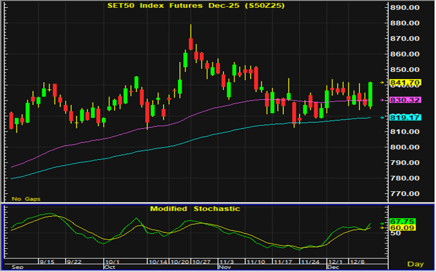 ตลาดหุ้นไทยอ่อนตัวลงช่วงเปิดตลาดตอบรับประเด็นในประเทศจากปัญหาชายแดนไทย-กัมพูชา ก่อนที่ช่วงท้ายตลาดจะเริ่มมีแรงซื้อหุ้นกลุ่มท่องเที่ยวและกลุ่มที่เกี่ยวข้องกับการบริโภคในประเทศกลับเข้ามา จนทำให้ดัชนีปิดตลาดเพิ่มขึ้นในปริมาณมาก ความชัดเจนเรื่องการเลือกตั้งกลับมาเป็นปัจจัยบวกต่อการลงทุน อย่างไรก็ตามภาพรวมการเคลื่อนไหวของตลาดหุ้นไทยซึ่งมีปัจจัยกดดันทั้งจากปัญหาชายแดนไทย-กัมพูชา และอาจส่งผลต่อการเจรจาการค้ากับสหรัฐ รวมทั้งความไม่แน่นอนทางการเมือง ส่งผลให้กรอบการฟื้นตัวของดัชนีตลาดหุ้นไทยมีจำกัด หุ้นกลุ่มท่องเที่ยว หุ้นกลุ่มบริโภคในประเทศและกลุ่มที่ได้ประโยชน์จากการแข็งค่าของเงินบาท ยังเป็นกลุ่มที่คาดว่าจะมีแรงซื้อกลับเข้ามา การเก็งกำไรในสัญญาเดือน Z แนะนำรอเปิดสถานะซื้อใกล้แนวรับบริเวณ 836-837 จุด และมีจุดขายตัดขาดทุนอยู่ที่ 833 จุด ส่วนแนวต้านสำหรับเก็งกำไรฝั่งขายในระหว่างวันอยู่ที่บริเวณ 847-848 จุด และมีจุดปิดสถานะตัดขาดทุนอยู่ที่ 850 จุด