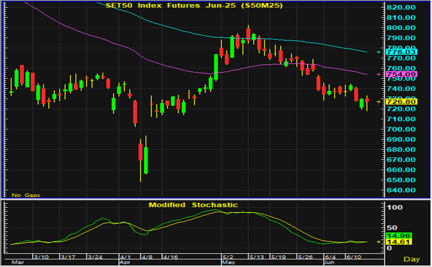 ตลาดหุ้นไทยวานนี้แกว่งตัวผันผวนเคลื่อนไหวสลับขึ้นลงทั้งแดนบวกและลบ ก่อนที่จะปิดตลาดอ่อนตัวลงจากระดับปิดของวันศุกร์ ความกังวลปัญหาทางภูมิรัฐศาสตร์เป็นประเด็นกดดันการลงทุน แต่ด้วยราคาหุ้นในตลาดหุ้นไทยซึ่งส่วนใหญ่ปรับตัวลงมามาก ในช่วงที่ดัชนีอ่อนตัวลงจึงมีแรงซื้อเก็งกำไรกลับเข้ามา ส่วนปัญหาระว่างอิสราเอลและอิหร่านนั้น หากไม่มีเหตุรุนแรงใดๆเพิ่มเติม คาดว่าแรงกดดันจากประเด็นนี้จะเริ่มลดลง และคาดว่านักลงทุนจะกลับมาให้ความสนใจประเด็นทางเศรษฐกิจโดยเฉพาะการประชุมของธนาคารกลางสหรัฐที่จะทราบผลการประชุมในช่วงค่ำของวันพุธ ส่วนการเคลื่อนไหวของตลาดหุ้นไทยในระยะนี้ด้วยราคาหุ้นที่ปรับตัวลงมามาก จึงมีแนวโน้มที่จะมีการดีดตัวทางเทคนิคเกิดขึ้น การเก็งกำไรในสัญญาเดือน M แนะนำเปิดสถานะซื้อใกล้แนวรับบริเวณ 719-720 จุด และมีจุดขายตัดขาดทุนอยู่ที่ 715 จุด ส่วนแนวต้านสำหรับเปิดสถานะขายในระหว่างวันอยู่ที่บริเวณ 733-734 จุด และมีจุดปิดสถานะตัดขาดทุนอยู่ที่ 737 จุด