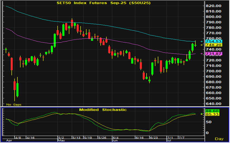 ดัชนีตลาดหุ้นไทยวานนี้แกว่งตัวสลับขึ้นลงทั้งแดนบวกและลบก่อนที่จะปิดตลาดอ่อนตัวลงจากระดับปิดของวันอังคาร คาดว่าเป็นแรงขายทำกำไรที่มีกลับออกมาหลังจากดัชนีปรับตัวขึ้นต่อเนื่องติดต่อกันหลายสัปดาห์ การเจรจาการค้าระหว่างสหรัฐและประเทศต่างๆเป็นประเด็นที่ต้องติดตาม และด้วยข้อตกลงของสหรัฐกับบางประเทศที่ลดระดับภาษีลงจากที่เคยกำหนดไว้ ส่งผลให้นักลงทุนประเมินว่าการเจรจาระหว่างสหรัฐและไทยอาจได้ข้อตกลงดีขึ้นจากการเจรจาครั้งก่อน ซึ่งต้องรอติดตามว่าการเจรจาจะบรรลุข้อตกลงกันได้ก่อนครบกำหนดที่จะมีการใช้ภาษีอัตราใหม่หรือไม่ ส่วนประเด็นอื่นๆนอกจากประเด็นการเมืองในประเทศแล้ว การรายงานผลประกอบการไตรมาส 2 ของหุ้นกลุ่มสถาบันการเงินเป็นอีกหนึ่งประเด็นที่นักลงทุนให้ความสนใจ การเก็งกำไรในสัญญาเดือน U แนะนำเปิดสถานะซื้อใกล้แนวรับ 742-743 จุด และมีจุดขายตัดขาดทุนอยู่ที่ 740 จุด โดยมีแนวต้านสำหรับเก็งกำไรฝั่งขายอยู่ที่บริเวณ 755-756 จุด และมีจุดปิดสถานะตัดขาดทุนอยู่ที่ 760 จุด