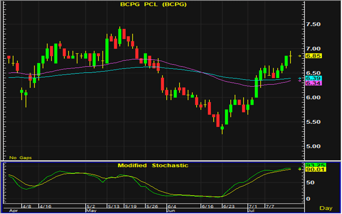 ราคาหุ้น BCPG แกว่งตัวแคบในการซื้อขายวานนี้ แต่การเคลื่อนไหวทางเทคนิคโดยรวมยังมีแนวโน้มฟื้นตัว หากในระหว่างวันเคลื่อนไหวเหนือแนวรับ 6.7-6.75 บาท แนะนำเปิดสถานะซื้อ และมีจุดขายตัดขาดทุนอยู่ที่ 6.6 บาท