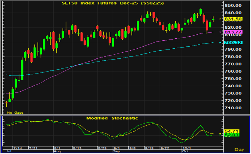 ดัชนีตลาดหุ้นไทยวานนี้ปิดตลาดเพิ่มขึ้นต่อเนื่องจากวันพุธ ปัจจัยต่างประเทศทั้งปัญหาการค้าระหว่างประเทศรวมทั้งปัญหาทางการคลังของรัฐบาลสหรัฐเป็นประเด็นกดดันการลงทุน โดยปัญหาการค้าระหว่างจีนและสหรัฐนั้น หากทั้ง 2 ประเทศ ยังไม่สามารถเจรจาเพื่อลดอุปสรรคเรื่องการค้าได้ ก็จะเป็นปัจจัยลบต่อภาวะเศรษฐกิจโดยรวม และจะเป็นปัจจัยกดดันการลงทุนต่อไป อย่างไรก็ตามกำหนดการที่ผู้นำของทั้ง 2 ประเทศ จะเข้าร่วมการประชุม APEC ช่วงปลายเดือน จึงเป็นที่สนใจของนักลงทุนว่าอาจมีการเจรจาเพื่อหาข้อตกลงเรื่องการค้าในการประชุมครั้งนี้ ส่วนประเด็นในประเทศที่น่าสนใจอยู่ที่การรายงานผลประกอบการของหุ้นกลุ่มสถาบันการเงิน ที่คาดว่าจะเป็นประเด็นที่ทำให้มีแรงซื้อเก็งกำไรกลับเข้ามา การเก็งกำไรในสัญญาเดือน Z มีแนวรับสำหรับเปิดสถานะซื้อเก็งกำไรอยู่ที่บริเวณ  825-826 จุด และมีจุดขายตัดขาดทุนอยู่ที่ 823 จุด โดยมีแนวต้านสำหรับเปิดสถานะขายอยู่ที่ 835-836 จุด และมีจุดปิดสถานะตัดขาดทุนอยู่ที่ 838 จุด