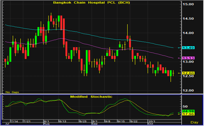 ราคาหุ้น BCH แกว่งตัวแคบในการซื้อขายวานนี้ แต่ด้วยสัญญาณซื้อที่เกิดขึ้นช่วงต้นสัปดาห์จึงมีแนวโน้มที่จะมีการฟื้นตัวทางเทคนิค โดยมีแนวรับสำหรับเปิดสถานะซื้ออยู่ที่ 12.3-12.4 บาท และมีจุดขายตัดขาดทุนอยู่ที่บริเวณ 12 บาท