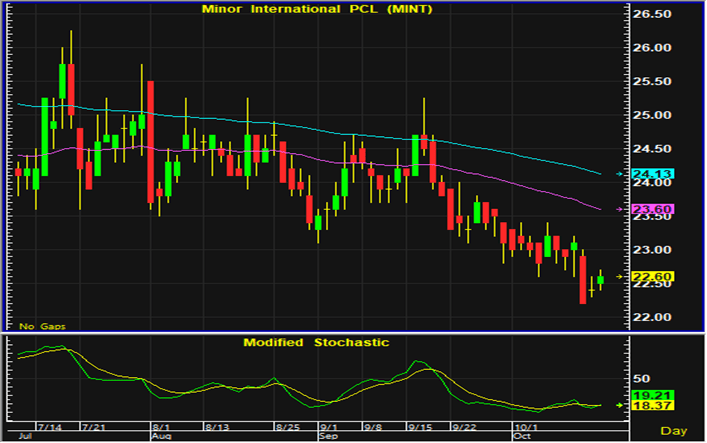ราคาหุ้น MINT ปิดตลาดเพิ่มขึ้นต่อเนื่องเป็นวันที่ 2 และเริ่มมีสัญญาณการฟื้นตัวทางเทคนิคเกิดขึ้น การเก็งกำไรระยะสั้นแนะนำเปิดสถานะซื้อใกล้แนวรับบริเวณ 22.3-22.4 บาท และมีจุดขายตัดขาดทุนอยู่ที่ 22 บาท