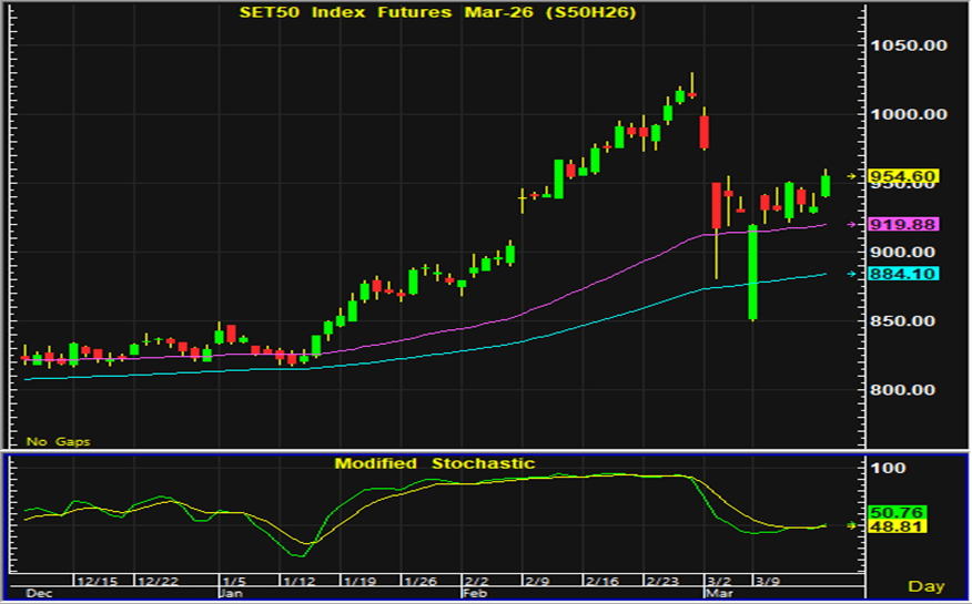 ดัชนีตลาดหุ้นไทยวานนี้มีแรงซื้อเข้ามาตั้งแต่ช่วงเปิดตลาดภาคเช้า และในระหว่างวันหุ้นขนาดใหญ่ในหลายกลุ่มต่างมีแรงซื้อเข้ามาจนทำให้ดัชนีปิดตลาดเพิ่มขึ้นในปริมาณมาก ปัจจัยบวกในประเทศจากการจัดตั้งรัฐบาลซึ่งสัปดาห์นี้จะมีการลงมติเลือกนากยรัฐมนตรี รวมทั้งการไหลเข้าของเงินทุนเป็นปัจจัยบวกต่อการเคลื่อนไหวของตลาดหุ้นไทย ขณะที่ประเด็นต่างประเทศนอกจากสถานการณ์ในตะวันออกลกางแล้ว การประชุมของธนาคารกลางสหรัฐที่จะทราบผลการประชุมช่วงค่ำนี้ เป็นอีกประเด็นที่นักลงทุนให้ความสนใจ โดยคาดว่าการประชุมครั้งนี้จะยังไม่มีการปรับอัตราดอกเบี้ย แต่ต้องติดตามมุมมองต่อเศรษฐกิจโดยเฉพาะการเร่งตัวขึ้นของราคาพลังงาน ที่อาจส่งผลต่อการประเมินทิศทางดอกเบี้ยในอนาคต การเก็งกำไรในสัญญาเดือน H แนะนำเปิดสถานะซื้อใกล้แนวรับบริเวณ 949-950 จุด และมีจุดขายตัดขาดทุนอยู่ที่ 945 จุด ส่วนแนวต้านสำหรับเก็งกำไรฝั่งขายในระหว่างวันอยู่ที่บริเวณ 965-966 จุด และมีจุดปิดสถานะตัดขาดทุนอยู่ที่ 970 จุด