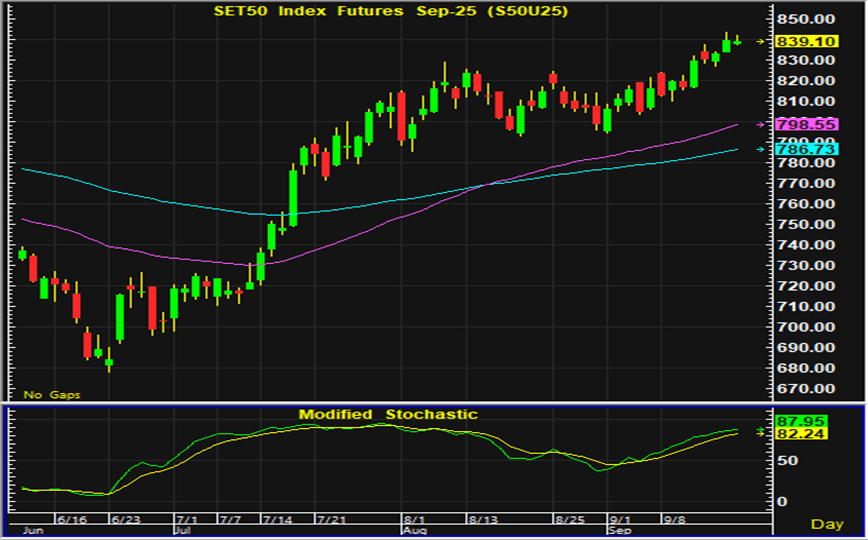 ดัชนีตลาดหุ้นไทยวานนี้แกว่งตัวแคบก่อนที่จะปิดตลาดทรงตัวใกล้ระดับปิดของวันอังคาร นักลงทุนต่างใช้ความระมัดระวังในการลงทุนเพื่อติดตามการประชุมของธนาคารกลางสหรัฐ ซึ่งช่วงค่ำที่ผ่านมามีมติลดอัตราดอกเบี้ยลงร้อยละ 0.25 ตามที่นักลงทุนส่วนใหญ่ประเมิน และมีแนวโน้มที่จะปรับลดดอกเบี้ยลงต่อในการประชุมครั้งถัดไป โดยข้อมูลเศรษฐกิจในตลาดแรงงานรวมทั้งเงินเฟ้อในอนาคต เป็นประเด็นที่ธนาคารกลางสหรัฐให้ความสำคัญ ผลการประชุมดังกล่าวโดยรวมแล้วไม่ต่างจากที่นักลงทุนส่วนใหญ่ประเมิน คาดว่าจะมีผลต่อการเคลื่อนไหวของตลาดหุ้นไทยในวันนี้ค่อนข้างน้อย แต่ในภาพรวมเงินทุนมีแนวโน้มไหลออกจากสหรัฐไปยังประเทศอื่นๆจึงเป็นปัจจัยบวกต่อการเคลื่อนไหวของตลาดหุ้นไทยต่อไป การเก็งกำไรในสัญญาเดือน U แนะนำรอเปิดสถานะซื้อใกล้แนวรับ 832-833 จุด และมีจุดขายตัดขาดทุนอยู่ที่ 830 จุด โดยมีแนวต้านสำหรับเก็งกำไรฝั่งขายอยู่ที่ 844-845 จุด และมีจุดปิดสถานะตัดขาดทุนอยู่ที่ 847 จุด