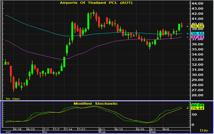 ราคาหุ้น AOT อ่อนตัวลงในการซื้อขายวานนี้ คาดว่าเป็นแรงขายทำกำไรในระยะสั้นที่มีกลับออกมา และยังมีแนวโน้มที่จะปรับตัวขึ้นต่อ หากในระหว่างวันยืนเหนือแนวรับ 38.75-39 บาท แนะนำเปิดสถานะซื้อ และมีจุดขายตัดขาดทุนอยู่ที่ 38 บาท