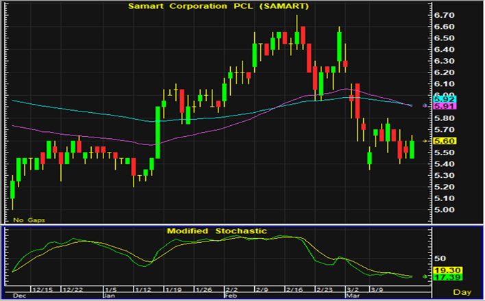 ราคาหุ้น SAMART เริ่มมีสัญญาณการฟื้นตัวทางเทคนิคเกิดขึ้น หากในระหว่างวันเคลื่อนไหวใกล้แนวรับบริเวณ 5.4-5.45 บาท แนะนำเปิดสถานะซื้อเก็งกำไร และมีจุดขายตัดขาดทุนอยู่ที่ 5.3 บาท