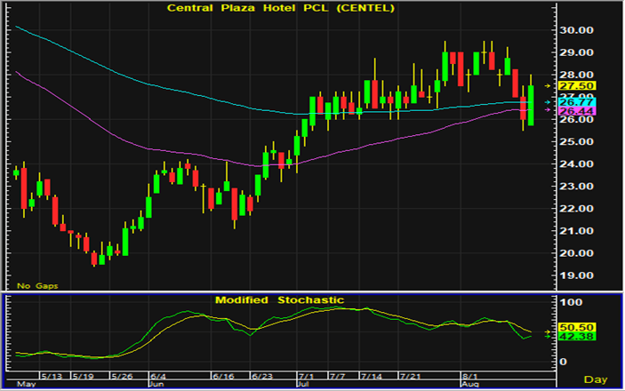 ราคาหุ้น CENTEL วานนี้ดีดตัวขึ้นในปริมาณค่อนข้างมาก ส่งผลให้การเคลื่อนไหวทางเทคนิคกลับมาเคลื่อนไหวในทิศทางฟื้นตัว การเก็งกำไรระยะสั้นแนะนำเปิดสถานะซื้อใกล้แนวรับบริเวณ 26.5-26.75 บาท และมีจุดขายตัดขาดทุนอยู่ที่ 26 บาท