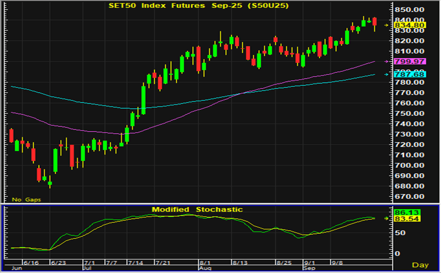 ดัชนีตลาดหุ้นไทยดีดตัวขึ้นช่วงเปิดตลาด ก่อนที่จะเริ่มมีแรงขายกลับออกมาในระหว่างวัน กดดันดัชนีปิดตลาดอ่อนตัวลง ผลการประชุมของธนาคารกลางสหรัฐซึ่งโดยรวมแล้วไม่ต่างจากที่นักลงทุนประเมิน จึงเริ่มมีแรงขายทำกำไรกลับออกมา โดยผลการประชุมดังกล่าวมีสัญญาณว่าธนาคารกลางสหรัฐจะลดดอกเบี้ยลงในอนาคต ซึ่งสะท้อนถึงความกังวลเรื่องเศรษฐกิจโดยเฉพาะในตลาดแรงงาน ขณะที่ปัญหาเงินเฟ้อแม้จะลดแรงกดดันลง แต่ยังต้องติดตามผลของนโยบายกีดกันการค้าของสหรัฐที่อาจส่งผลให้เงินเฟ้อทรงตัวในระดับสูง อย่างไรก็ตามการลดดอกเบี้ยของสหรัฐ เป็นปัจจัยบวกต่อตลาดหุ้นไทยผ่านการไหลเข้าของเงินทุน การเคลื่อนไหวโดยรวมจึงยังมีแนวโน้มฟื้นตัว แต่ในระยะสั้นมีสัญญาณเตือนการปรับฐาน การเก็งกำไรในสัญญาเดือน U แนะนำรอเปิดสถานะซื้อใกล้แนวรับ 827-828 จุด และมีจุดขายตัดขาดทุนอยู่ที่ 825 จุด โดยมีแนวต้านสำหรับเก็งกำไรฝั่งขายอยู่ที่ 840-841 จุด และมีจุดปิดสถานะตัดขาดทุนอยู่ที่ 845 จุด