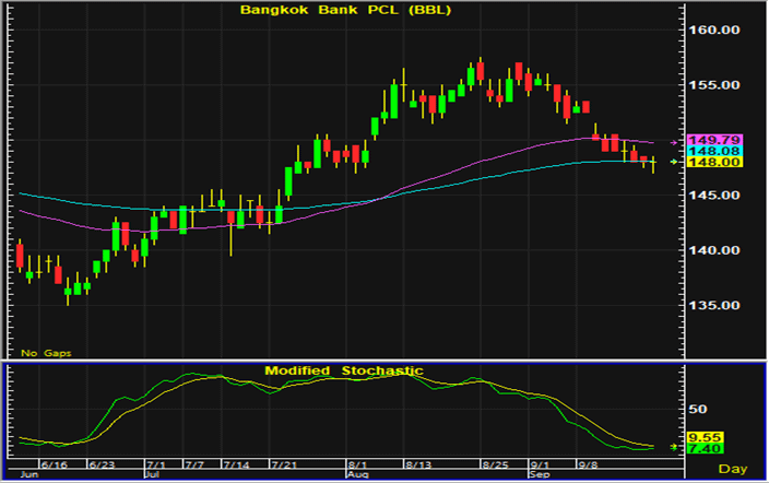 ราคาหุ้น BBL ปรับตัวลงต่อเนื่องติดต่อกันหลายวัน และวานนี้กลับมาแกว่งตัวแคบและเคลื่อนไหวทรงตัวใกล้แนวรับสำคัญทางเทคนิคบริเวณ 146.5-147 บาท หากไม่ลงไปต่ำกว่าแนวรับนี้ แนะนำเปิดสถานะซื้อเก็งกำไร และมีจุดขายตัดขาดทุนอยู่ที่ 146 บาท