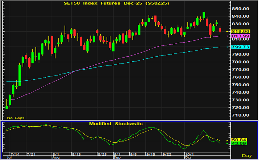 ดัชนีตลาดหุ้นไทยปิดตลาดปรับตัวลงในการซื้อขายวันศุกร์ และเป็นการปิดตลาดปรับตัวลงต่อเนื่องเป็นสัปดาห์ที่ 2 แรงกดดันจากประเด็นต่างประเทศ ทั้งปัญหารค้าระหว่างประเทศ และปัญหาทางการคลังของรัฐบาลสหรัฐเป็นปัจจัยกดดันการลงทุน ขณะที่ประเด็นในประเทศเรื่องการกระตุ้นเศรษฐกิจของรัฐบาลเป็นปัจจัยบวกต่อหุ้นกลุ่มที่เกี่ยวข้อง อย่างไรก็ตามด้วยราคาหุ้นในตลาดหุ้นไทยในหลายกลุ่มปรับตัวขึ้นต่อเนื่องติดต่อกันหลายสัปดาห์ หากยังไม่มีปัจจัยบวกใหม่ๆการเคลื่อนไหวของตลาดหุ้นไทยในระยะนี้มีแนวโน้มปรับฐาน ส่วนประเด็นที่ต้องติดตามในสัปดาห์นี้นอกจากประเด็นการคลังของสหรัฐแล้ว รายงานผลประกอบการไตรมาส 3 ของหุ้นกลุ่มสถาบันการเงินเป็นประเด็นที่คาดว่าจะส่งผลให้มีแรงซื้อเก็งกำไรกลับเข้ามา การเก็งกำไรในสัญญาเดือน Z มีแนวรับสำหรับเปิดสถานะซื้อเก็งกำไรอยู่ที่บริเวณ 816-817 จุด และมีจุดขายตัดขาดทุนอยู่ที่ 813 จุด โดยมีแนวต้านสำหรับเปิดสถานะขายอยู่ที่ 826-827 จุด และมีจุดปิดสถานะตัดขาดทุนอยู่ที่ 823 จุด
