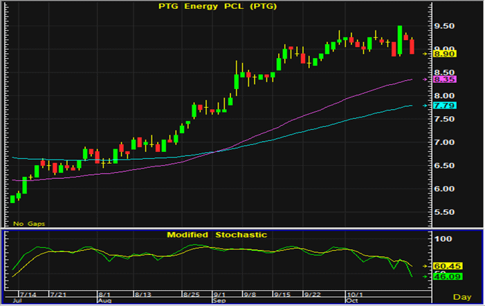 ราคาหุ้น PTG ปิดตลาดปรับตัวลงในปริมาณมากในการซื้อขายวันศุกร์ และกลับลงมาเคลื่อนไหวใกล้แนวรับสำคัญทางเทคนิคบริเวณ 8.75-8.8 บาท หากยังไม่กลับลงไปปิดต่ำกว่าแนวรับนี้ แนะนำเปิดสถานะซื้อเก็งกำไร และมีจุดขายตัดขาดทุนอยู่ที่ 8.6 บาท