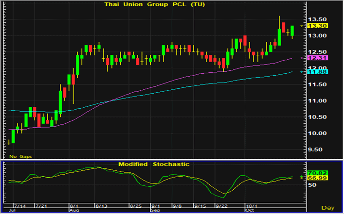 ราคาหุ้น TU เริ่มฟื้นตัวและปิดตลาดที่จุดสูงสุดของวัน การเคลื่อนไหวทางเทคนิคจึงยังมีแนวโน้มฟื้นตัว การเก็งกำไรฝั่งซื้อแนะนำเปิดสถานะใกล้แนวรับบริเวณ 12.9-13 บาท และมีจุดขายตัดขาดทุนอยู่ที่ 12.5 บาท