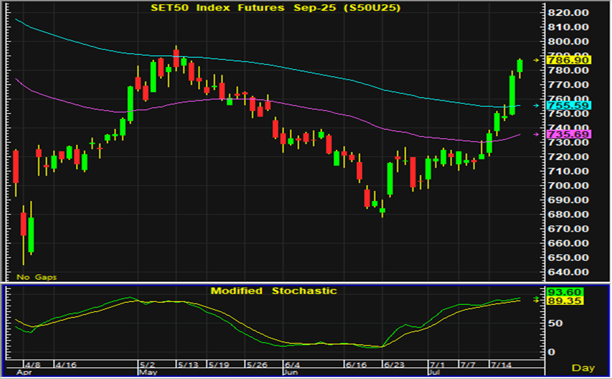 สัปดาห์ที่ผ่านมาดัชนีตลาดหุ้นไทยปิดตลาดเพิ่มขึ้นในปริมาณมาก นักลงทุนต่างคาดหวังว่าการเจรจาการค้าจะสามารถบรรลุข้อตกลงและลดระดับภาษีจากเดิมที่สหรัฐกำหนดไว้ในเดือนเมษายน ซึ่งประเด็นนี้ยังต้อรอติดตามความชัดเจนว่าจะบรรลุข้อตกลงได้ทันก่อนกำหนดใช้อัตราภาษีใหม่ในเดือนสิงหาคมหรือไม่ ส่วนประเด็นอื่นๆที่ต้องติดตามอยู่ที่การรายงานผลประกอบการไตรมาส 2 ของบริษัทจดทะเบียน รวมทั้งประเด็นการเมืองในประเทศที่อาจกลับมาเป็นปัจจัยกดดันการลงทุน การเก็งกำไรในตลาดหุ้นไทยในระยะสั้นด้วยดัชนีที่ปรับขึ้นมามาก หากยังไม่มีความชัดเจนเรื่องการเจรจาการค้าของไทยและสหรัฐ ควรระวังแรงขายทำกำไรที่คาดว่าจะเริ่มมีกลับออกมา การเก็งกำไรในสัญญาเดือน U ซึ่งปรับตัวเพิ่มขึ้นต่อเนื่องติดต่อกันหลายวัน แนะนำรอเปิดสถานะซื้อใกล้แนวรับ 773-774 จุด และมีจุดขายตัดขาดทุนอยู่ที่ 770 จุด โดยมีแนวต้านสำหรับเก็งกำไรฝั่งขายอยู่ที่ 795-796 จุด และมีจุดปิดสถานะตัดขาดทุนอยู่ที่ 798 จุด