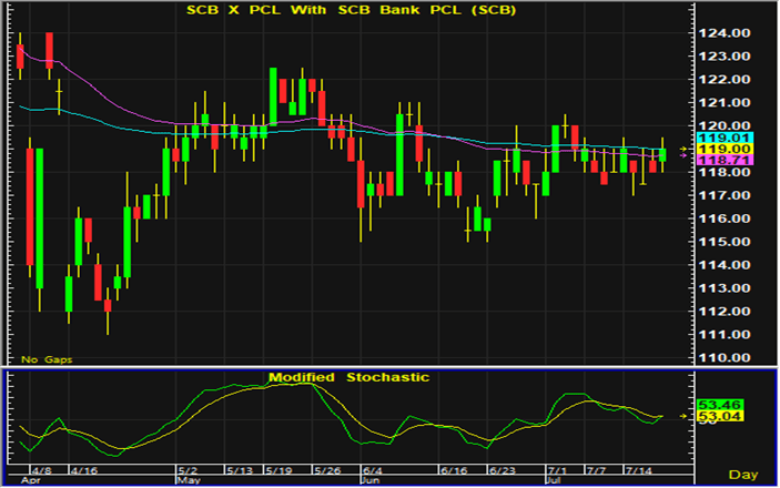 ราคาหุ้น SCB แกว่งตัวแคบต่อเนื่องติดต่อกันหลายวัน หากไม่กลับลงไปเคลื่อนไหวต่ำกว่าแนวรับบริเวณ 116-117 บาท ยังมีแนวโน้มที่จะปรับตัวขึ้น และแนะนำเปิดสถานะซื้อเก็งกำไรใกล้แนวรับดังกล่าว โดยมีจุดขายตัดขาดทุนอยู่ที่ 115 บาท