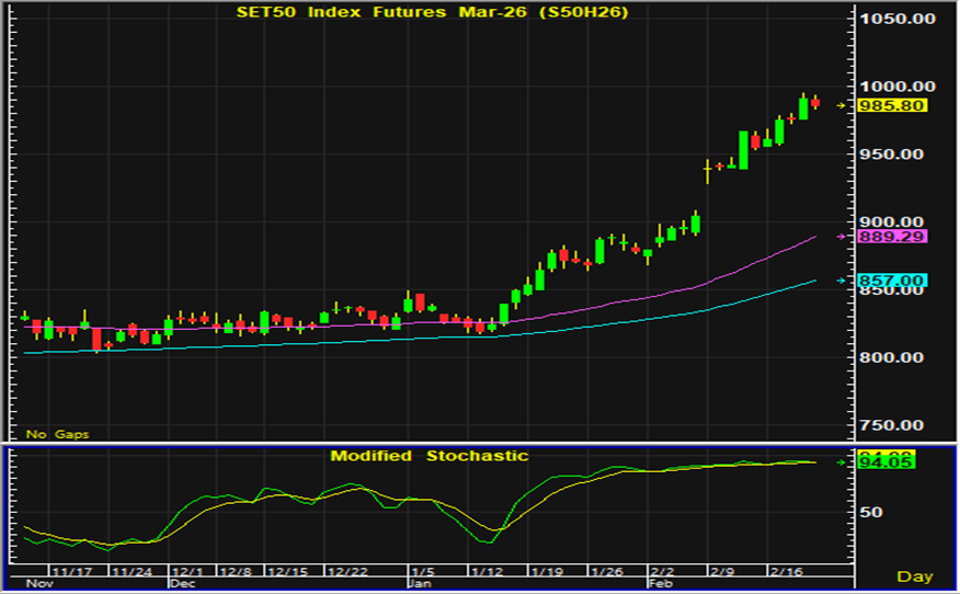 ดัชนีตลาดหุ้นไทยปิดตลาดปรับตัวลงในปริมาณมากในการซื้อขายวันศุกร์ แต่ยังเป็นการปิดตลาดเพิ่มขึ้นต่อเนื่องเป็นสัปดาห์ที่ 6 การไหลเข้าของเงินทุนเป็นปัจจัยบวกต่อการเคลื่อนไหวของตลาดหุ้นไทย แต่ด้วยราคาหุ้นดีดตัวขึ้นตอบรับประเด็นต่างๆมาพอสมควร ในระยะสั้นจึงเริ่มมีแนวโน้มที่จะเกิดการปรับฐาน ส่วนในสัปดาห์นี้นอกจากประเด็นที่เกี่ยวข้องกับการเมืองในประเทศ ทั้งการจัดตั้งรัฐบาลและปัญหาเกี่ยวกับการจัดการเลือกตั้งที่เป็นประเด็นที่นักลงทุนให้ความสนใจแล้ว นโยบายภาษีการค้าของสหรัฐหลังศาลฎีกาตัดสินว่ามาตรการภาษีที่รัฐบาลนำมาใช้ขัดกับข้อกฎหมาย ในระยะสั้นแม้จะทำให้แรงกดดันจากประเด็นนี้ลดลง แต่ยังต้องติดตามมาตรการอื่นๆที่รัฐบาลสหรัฐเตรียมนำมาใช้ และอาจกลับมาเป็นปัจจัยกดดันการลงทุนการเก็งกำไรในสัญญาเดือน H แนะนำรอเปิดสถานะซื้อใกล้แนวรับ 977-978 จุด และมีจุดขายตัดขาดทุนอยู่ที่ 975 จุด ส่วนแนวต้านสำหรับเก็งกำไรฝั่งขายในระหว่างวันอยู่ที่ 997-998 จุด และมีจุดปิดสถานะตัดขาดทุนอยู่ที่ 1,000 จุด