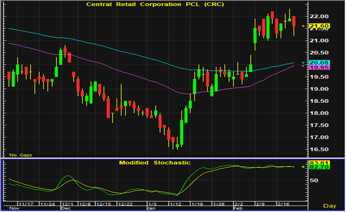 ราคาหุ้น CRC เริ่มอ่อนตัวลงในการซื้อขายวันศุกร์ และกลับลงมาเคลื่อนไหวใกล้แนวรับบริเวณ 21-21.1 บาท หากยังยืนเหนือแนวรับนี้ คาดว่าจะมีการดีดตัวทางเทคนิคเกิดขึ้น และแนะนำเปิดสถานะซื้อเก็งกำไรใกล้แนวรับดังกล่าว โดยมีจุดขายตัดขาดทุนอยู่ที่ 20.8 บาท