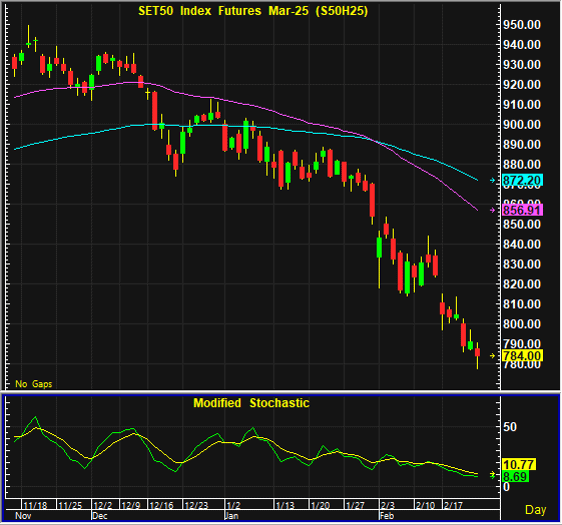 ตลาดหุ้นไทยปรับตัวลงตามตลาดหุ้นต่างประเทศ แต่ด้วยราคาหุ้นในหลายกลุ่มปรับตัวลงมามาก กรอบการอ่อนตัวในระหว่างวันจึงมีค่อนข้างจำกัด ความไม่แน่นอนของนโยบายการค้าของสหรัฐกับประเทศต่างๆ รวมทั้งโอกาสที่ธนาคารกลางสหรัฐจะลดดอกเบี้ยเพียง 1-2 ครั้ง ในปีนี้ เป็นปัจจัยกดดันการลงทุน ขณะที่รายงานผลประกอบการของบริษัทจดทะเบียนที่มีแนวโน้มออกมาดีขึ้น เป็นปัจจัยบวกที่ทำให้มีแรงซื้อเก็งกำไรกลับเข้ามา ส่วนประเด็นที่นักลงทุนให้ความสนใจอยู่ที่การประชุมของคณะกรรมการนโยบายการเงินในวันพุธ ซึ่งนักลงทุนต่างเริ่มประเมินว่าในการประชุมครั้งนี้อาจมีการลดดอกเบี้ยลงหลังข้อมูลเศรษฐกิจไทยมีสัญญาณชะลอตัว การเก็งกำไรในสัญญาเดือน H แนะนำเปิดสถานะซื้อใกล้แนวรับบริเวณ 777-778 จุด และมีจุดขายตัดขาดทุนอยู่ที่ 775 จุด โดยมีแนวต้านสำหรับเปิดสถานะขายอยู่ที่ 789-790 จุด และมีจุดปิดสถานะตัดขาดทุนอยู่ที่ 793 จุด