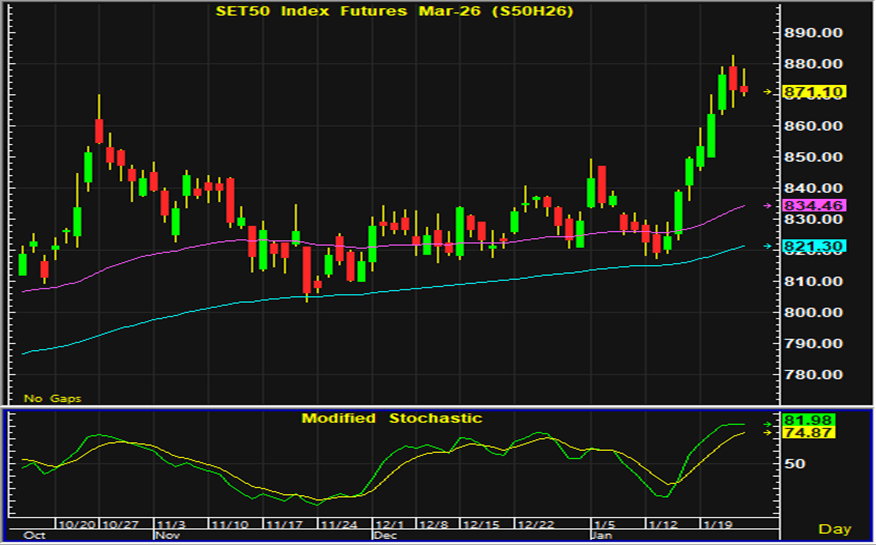 ดัชนีตลาดหุ้นไทยสัปดาห์ที่ผ่านมาปรับตัวเพิ่มขึ้นในปริมาณมาก ปัญหาระหว่างสหรัฐและยุโรปจากกรณีของเกาะกรีนแลนด์ที่แรงกดดันเริ่มลดลง รวมทั้งราคาหุ้นในตลาดหุ้นไทยซึ่งปรับตัวลงมามาก จึงทำให้กลับมาเป็นที่สนใจของนักลงทุน ส่วนสัปดาห์นี้ประเด็นที่นักลงทุนให้ความสนใจอยู่ที่การประชุมของคณะกรรมการนโยบายการเงินของสหรัฐที่จะทราบผลการประชุมในช่วงกลางสัปดาห์ แม้ในการประชุมครั้งนี้คาดว่าจะไม่มีการลดดอกเบี้ย แต่แนวโน้มการดำเนินนโยบายการเงินในอนาคตมีแนวโน้มที่จะผ่อนคลายต่อไป การเคลื่อนไหวของตลาดหุ้นไทยซึ่งดีดตัวขึ้นมามาก ในระยะสั้นควรระวังแรงขายที่คาดว่าจะมีกลับออกมา ปัญหาทางภูมิรัฐศาสตร์ รวมทั้งการระบาดของเชื้อไวรัสในอินเดีย กลับมาเป็นปัจจัยกดดันการลงทุน  การเก็งกำไรในสัญญาเดือน H แนะนำรอเปิดสถานะซื้อใกล้แนวรับ 860-861 จุด และมีจุดขายตัดขาดทุนอยู่ที่ 858 จุด ส่วนแนวต้านสำหรับเก็งกำไรฝั่งขายในระหว่างวันอยู่ที่ 876-877 จุด และมีจุดปิดสถานะตัดขาดทุนอยู่ที่ 880 จุด
