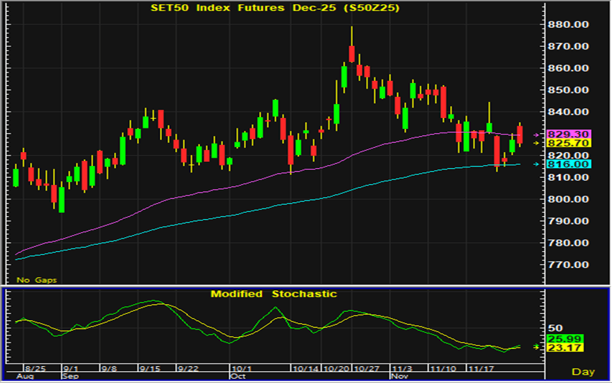 ดัชนีตลาดหุ้นไทยวานนี้ดีดตัวช่วงเปิดตลาดก่อนที่จะมีแรงขายกลับออกมาในการซื้อขายระหว่างวัน กดดันดัชนีปิดตลาดอ่อนตัวลง นักลงทุนต่างใช้ความระมัดระวังในการลงทุนเพื่อติดตามข้อมูลเศรษฐกิจและแนวโน้มการดำเนินนโยบายการเงินของสหรัฐ ขณะที่สถานการณ์อุทกภัยในประเทศซึ่งมีความกังวลว่าอาจส่งผลต่อเศรษฐกิจในประเทศ เป็นอีกปัจจัยลบที่กลับมากดดันการลงทุน อย่างไรก็ตามหุ้นในกลุ่มที่เกี่ยวข้องกับการแก้ไขปัญหาหลังสถานการณ์คลี่คลาย เป็นกลุ่มที่คาดว่าจะมีแรงซื้อกลับเข้ามา นอกจากประเด็นดังกล่าวแล้วประเด็นการเมืองในประเทศที่เริ่มมีความไม่แน่นอน ส่งผลให้การเคลื่อนไหวของตลาดหุ้นไทยในระยะนี้มีกรอบการฟื้นตัวจำกัด การเก็งกำไรในสัญญาเดือน Z แนะนำรอเปิดสถานะซื้อใกล้แนวรับบริเวณ 817-818 จุด และมีจุดขายตัดขาดทุนอยู่ที่ 815 จุด ส่วนแนวต้านสำหรับเก็งกำไรฝั่งขายในระหว่างวันอยู่ที่บริเวณ 833-834 จุด และมีจุดปิดสถานะตัดขาดทุนอยู่ที่ 836 จุด