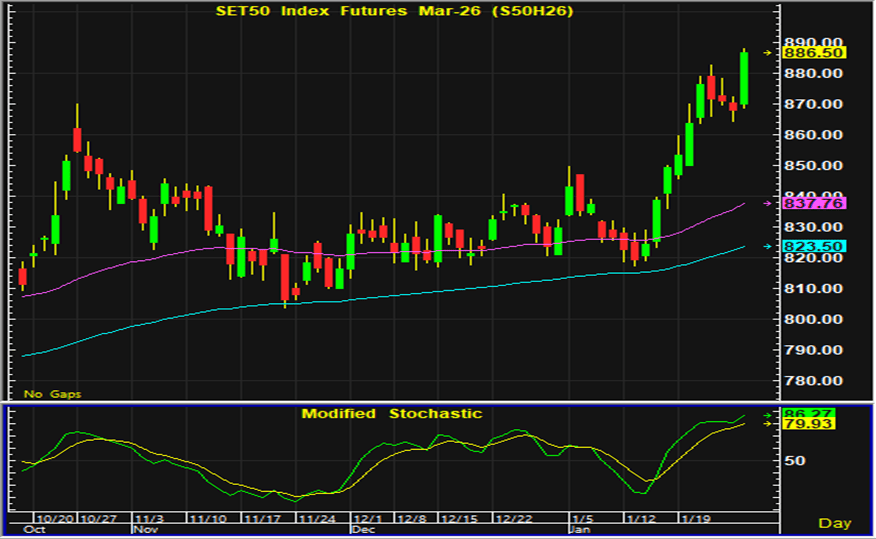 ดัชนีตลาดหุ้นไทยวานนี้ปิดตลาดเพิ่มขึ้นตามแรงซื้อหุ้นขนาดใหญ่ในหลายกลุ่มซึ่งปรับตัวขึ้นในปริมาณมาก การเลือกตั้งในเดือนกุมภาพันธ์ เป็นปัจจัยบวกต่อการเคลื่อนไหวของตลาดหุ้นไทย ขณะที่ประเด็นต่างประเทศที่น่าสนใจอยู่ที่การประชุมของคณะกรรมการนโยบายการเงินของสหรัฐที่จะทราบผลการประชุมในช่วงค่ำวันนี้ โดยคาดว่าในการประชุมครั้งนี้จะไม่มีการปรับอัตราดอกเบี้ยจากระดับปัจจุบัน แต่มุมมองต่อภาวะเศรษฐกิจ การจ้างงานและอัตราเงินเฟ้อ เป็นประเด็นที่คาดว่าจะส่งผลให้นักลงทุนประเมินว่าทิศทางดอกเบี้ยของสหรัฐยังมีแนวโน้มผ่อนคลาย ซึ่งจะเป็นปัจจัยบวกต่อการลงทุนต่อไป ส่วนการเคลื่อนไหวของตลาดหุ้นไทยในระยะสั้นอาจเริ่มมีแรงขายทำกำไรกลับออกมา แต่การเคลื่อนไหวโดยรวมยังมีแนวโน้มฟื้นตัว การเก็งกำไรในสัญญาเดือน H แนะนำเปิดสถานะซื้อใกล้แนวรับ 881-882 จุด และมีจุดขายตัดขาดทุนอยู่ที่ 878 จุด ส่วนแนวต้านสำหรับเก็งกำไรฝั่งขายในระหว่างวันอยู่ที่ 893-894 จุด และมีจุดปิดสถานะตัดขาดทุนอยู่ที่ 896 จุด