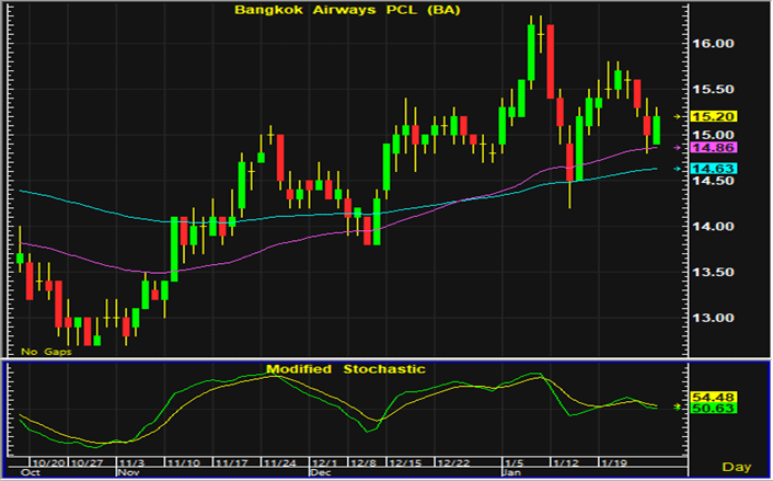 ราคาหุ้น BA เริ่มฟื้นตัวหลังกลับลงมาเคลื่อนไหวใกล้แนวรับบริเวณ 14.9-15 บาท การเคลื่อนไหวทางเทคนิคจึงยังมีแนวโน้มฟื้นตัว และแนะนำเปิดสถานะซื้อใกล้แนวรับดังกล่าว โดยมีจุดขายตัดขาดทุนอยู่ที่ 14.5 บาท