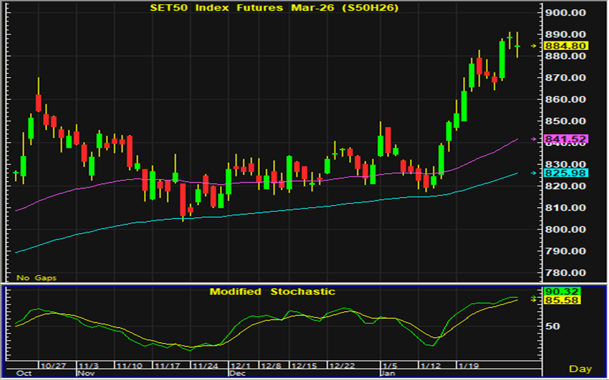ดัชนีตลาดหุ้นไทยวานนี้ปิดตลาดปรับตัวลงหลังจากในระหว่างวันแกว่งตัวสลับขึ้นลงทั้งแดนบวกและลบ ราคาหุ้นในตลาดหุ้นไทยในหลายกลุ่มซึ่งปรับตัวเพิ่มขึ้นมาพอสมควร ในระยะนี้จึงเริ่มมีแรงขายทำกำไรกลับออกมา ประเด็นต่างประเทศเกี่ยวกับสถานการณ์ทางภูมิรัฐศาสตร์เป็นประเด็นที่ต้องติดตามและอาจกลับมาเป็นปัจจัยกดดันการลงทุนหากสถานการณ์เริ่มมีความตึงเครียดมากขึ้น ส่วนประเด็นในประเทศนอกจากการเลือกตั้งในเดือนกุมภาพันธ์ที่เป็นประเด็นบวกต่อการเคลื่อนไหวของตลาดหุ้นไทยแล้ว การรายงานผลประกอบการไตรมาส 4 ของบริษัทจดทะเบียน เป็นอีกประเด็นที่นักลงทุนให้ความสนใจ โดยคาดว่าหุ้นกลุ่มท่องเที่ยว และกลุ่มบริโภคในประเทศ จะเป็นกลุ่มที่มีแรงซื้อเก็งกำไรกลับเข้ามา การเก็งกำไรในสัญญาเดือน H แนะนำเปิดสถานะซื้อใกล้แนวรับ 881-882 จุด และมีจุดขายตัดขาดทุนอยู่ที่ 878 จุด ส่วนแนวต้านสำหรับเก็งกำไรฝั่งขายในระหว่างวันอยู่ที่ 893-894 จุด และมีจุดปิดสถานะตัดขาดทุนอยู่ที่ 896 จุด