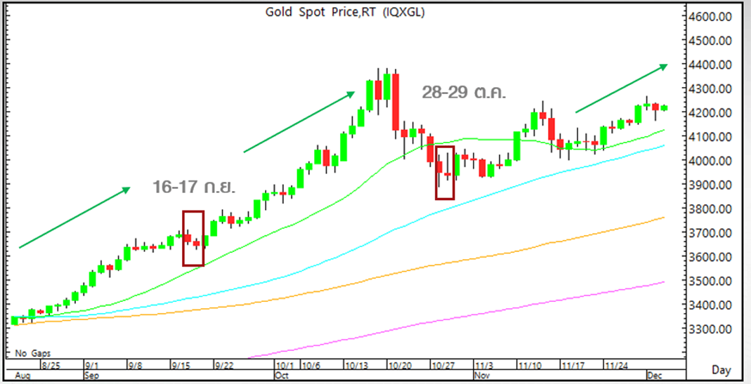 ในเดือนพฤศจิกายนโดยส่วนใหญ่ราคาทองคำอยู่ในช่วงของการปรับฐานและปรับลดลง ขณะที่ในช่วงครึ่งเดือนหลังของเดือนธันวาคมโดยปกติมีแรงซื้อกลับเข้ามา ซึ่งผลตอบแทนของทอง Spot เดือนธันวาคมเฉลี่ย 3 ปี 5 ปี และ 10 ปีที่ผ่านมาอยู่ที่ 1.16%  2.69% และ 2.2% ซึ่งให้ผลตอบแทนใช้ได้ทีเดียว ถึงแม้ว่าราคาทองคำตอนนี้แพงแล้วก็ตาม แต่คาดว่าจะยังคงมีแรงซื้อกลับเข้ามาในครึ่งเดือนหลังต่อเนื่องไปจนถึงเดือนมกราคมของปีหน้า แต่อาจจะไม่ได้หนาแน่นมากเหมือนทุกปี ดังนั้นแนะนำให้เข้าซื้อสะสมเมื่อราคาทองคำย่อลงมา จุดเข้าซื้อทอง Spot ที่ 4,100- 4,130 ดอลลาร์ ราคาทองไทยราว 62,500-62,800 บาท กรณีมีแรงเทขายทองคำอย่างหนักจนหลุด  4,100 ดอลลาร์ แนะนำเข้าซื้อเก็บที่ทอง Spot แนวรับ 4,000 ดอลลาร์ ราคาทองไทย 61,500 บาท