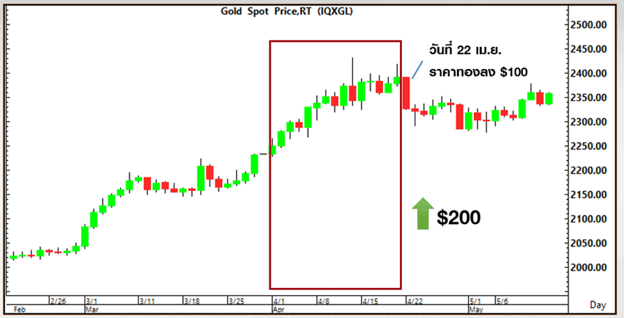 ปี 2567 เริ่มวันที่ 1 เมษายน อิสราเอลโจมตีสถานทูตอิหร่านในซีเรีย อิหร่านยังไม่ตอบโต้กลับทันที วันที่ 13 เมษายนอิหร่านตอบโต้ด้วยการยิงโดรนและขีปนาวุธใส่อิสราเอลโดยตรงเป็นครั้งแรกในประวัติศาสตร์ ในช่วงระยะเวลาที่มีความขัดแย้งกันระหว่างอิหร่าน-อิสราเอลนำไปสู่สงคราม ทำให้ราคาทองปรับขึ้นต่อเนื่องราว 200 ดอลลาร์ ในที่สุดสถานการณ์ตะวันออกกลางกลับมาสู่ภาวะปกติ ส่งผลให้มีแรงเทขายทองคำอย่างหนัก ราคาทองคำปรับตัวลงแรงถึง 100 ดอลลาร์ภายใน 1 วัน