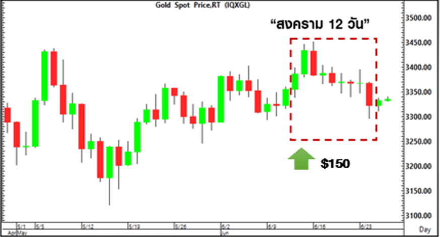 สงครามอิหร่าน-อิสราเอล 12 วัน (วันที่ 13-24 มิถุนายน 2568) สงครามเริ่มขึ้นในเช้าวันศุกร์ที่ 13 มิถุนายนอิสราเอลเปิดฉากโจมตีทางอากาศต่ออิหร่าน และคืนวันศุกร์ที่ 13 มิถุนายนอิหร่านโจมตีตอบโต้อิสราเอลกลับทันที หลังจากนั้นมีการโจมตีสู้รบระหว่างทั้ง 2 ประเทศยืดเยื้อราวกว่า 1 สัปดาห์ ตลาดรอดูท่าทีของสหรัฐจะเข้ามาร่วมในความขัดแย้งในครั้งนี้หรือไม่ ในที่สุดวันที่ 22 มิถุนายนสหรัฐโจมตีโรงงานนิวเคลียร์ของอิหร่าน 3 แห่ง วันที่ 24 มิถุนายนทรัมป์ประกาศอิหร่าน-อิสราเอลบรรลุข้อตกลงหยุดยิง สงครามได้สิ้นสุดลง ทำให้มีแรงเทขายทองคำอย่างหนัก สงครามอิหร่าน-อิสราเอล 12 วันทำให้ราคาทองปรับขึ้นราว 150 ดอลลาร์ แต่ที่น่าสังเกตราคาทองปรับขึ้นเพียงระยะสั้น 2-3 วัน หลังจากนั้นเริ่มมีแรงเทขายทำกำไรและลดลงกลับมาที่ราคาทองจุดเดิมก่อนสงคราม