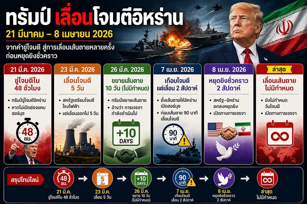 ทรัมป์ประกาศขยายเวลาหยุดยิงแบบไม่มีกำหนดเมื่อวันอังคาร (21 เม.ย.) จนกว่าจะได้หารือข้อเสนอของอิหร่านในการเจรจาสันติภาพ เป็นการ TACO ครั้งที่ 4 ของทรัมป์ในการทำสงครามกับอิหร่าน นับตั้งแต่วันที่ 21 มี.ค.ที่ทรัมป์ขู่โจมตีโรงไฟฟ้าทุกแห่งของอิหร่าน ถึงแม้ว่าทรัมป์ขยายเวลาหยุดยิงแบบไม่มีกำหนด ทำให้สถานการณ์สงครามผ่อนคลายลง หลีกเลี่ยงการโจมตีสู้รบอย่างรุนแรง แต่ดูเหมือนทรัมป์ได้ประกาศในลักษณะการตัดสินใจฝ่ายเดียว ท่าทีอิหร่านไม่ได้ระบุว่าได้ตกลงต่อการขยายเวลาหยุดยิงแต่อย่างใด