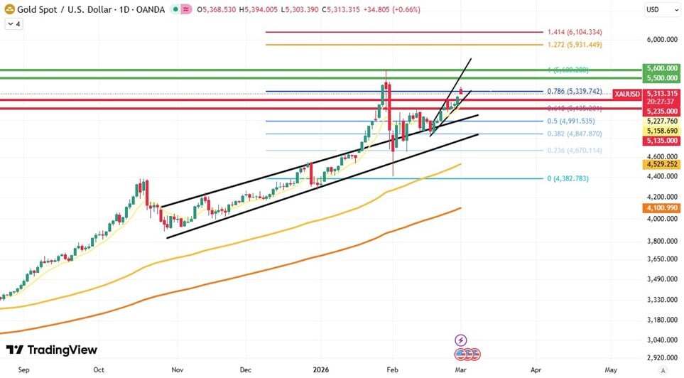 ราคาทองคำโลกในสัปดาห์นี้คาดว่าในทางเทคนิคระยะสั้นจะยังคง Sideway Up และสร้างรูปแบบ Expanding Triangle ในภาพเล็กหลังจากทองคำได้ปรับตัวลงทดสอบแนวรับสำคัญในภาพใหญ่บริเวณ 5,235 และ 5,135 ดอลลาร์ และมีการฟื้นตัวขึ้นในภายหลัง โดยหากทองคำไม่หลุดแนวรับดังกล่าว อาจทำให้ทองคำปรับตัวขึ้นทดสอบแนวต้านสำคัญที่ 5,500 และ 5,600 ดอลลาร์ ตามเส้น 1.0 ของ Fibonacci และ ตามเส้นแนวต้าน Trend Line และหากทองคำสามารถหากทะลุต้านที่ 2 ได้ อาจทำให้ราคาทองคำทดสอบแนวต้านสุดท้ายที่ 6,000 ดอลลาร์ ซึ่งไวกว่าการคาดการณ์ของ Deutsche Bank, Societe Generale, Bank Of Americe, ที่คาดการณ์ว่าทองจะปรับตัวขึ้นในช่วงสิ้นปี 2026 และเดือนก.พ. 2027 ตามลำดับ