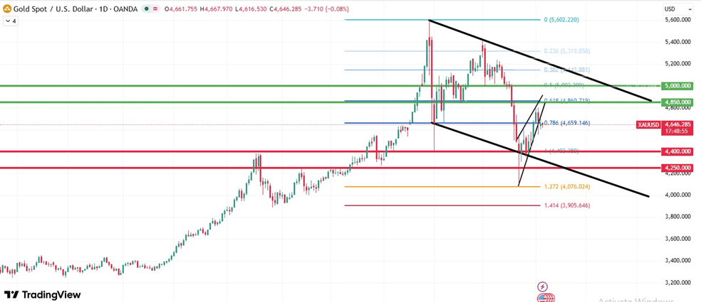 ราคาทองคำโลกในสัปดาห์นี้คาดว่าในทางเทคนิคได้เริ่มมีการ Rebound หลังจากได้มีการปรับตัวลงทดสอบแนวรับที่ 4,400 ดอลลาร์ และมีการฟื้นตัวขึ้น หลังจากราคาทองคำได้รับปัจจัยบวกจากนายเจอโรม พาวเวล ประธานเฟด ไม่ได้แสดงความกังวลถึงภาวะเงินเฟ้อจากราคาน้ำมันดิบที่พุ่งสูง ซึ่งอาจส่งผลให้ราคาทองคำมีการปรับตัวขึ้นต่อเนื่อง โดยมีแนวต้านที่ 4,850 และ 5,000 ดอลลาร์ ตามเส้น 0.618 และ 0.5 ของ Fibonacci ตามลำดับ อย่างไรก็ตาม หากในสัปดาห์นี้ ภาวะสงครามสหรัฐฯ – อิหร่านยังคงยืดเยื้อ และเงินเฟ้อ / GDP สหรัฐฯ ที่จะมีการประกาศในสัปดาห์นี้มีการขยายตัวขึ้น อาจส่งผลให้ราคาทองคำมีการปรับตัวลงทดสอบแนวรับที่ 4,400 และ 4,250 ดอลลาร์ ตามบริเวณแนวเส้นที่ 1 ของ Fibonacci ได้เช่นกัน
