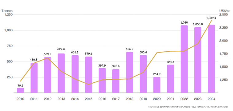 ในช่วง 3 ปีที่ผ่านมา ธนาคารกลางทั่วโลกเร่งสะสมทองคำต่อเนื่อง โดยปี 2022 มีการเพิ่มทองคำสำรองสุทธิที่ 1,080 ตัน ขณะที่ปี 2023 และ 2024 ยังมีแรงซื้อจากธนาคารกลางมากกว่า 1,000 ตันต่อปี