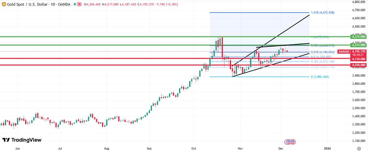 ราคาทองคำโลกในสัปดาห์นี้คาดว่าในทางเทคนิคระยะสั้นยังคงทรงตัวในกรอบ Rising Wedge แต่ระยะยาวยังคงมี Pattern แบบ Expanding Triangle ซึ่งเป็นการสะท้อนถึงภาวะ “ทยอยฟื้นตัว” หลังจากที่ตลาดได้รับรู้ปัจจัยบวกทางด้านความคิดเห็นที่ขัดแย้งต่อกรรมการเฟดและว่าที่ประธานเฟดคนใหม่ นายเควิน แฮสเซตต์ ซึ่งอาจส่งผลให้ทองคำปรับตัวขึ้นทดสอบแนวต้านสำคัญที่ 4,275 และ 4,375 ดอลลาร์ และอาจกระตุ้นแรงซื้อในตลาดทองคำได้รอบใหม่ อย่างไรก็ตาม หากตลาดรับรู้ปัจจัยลบจากความกังวลต่อนักลงทุนที่มีต่อแฮสเซตต์ รวมถึงแนวโน้มสันติภาพยูเครนที่กำลังก่อตัวขึ้น อาจทำให้ทองคำปรับตัวลงทดสอบแนวรับสำคัญที่ 4,110 และ 4,030 ดอลลาร์ ซึ่งหากหลุดแนวรับดังกล่าว อาจกระตุ้นให้ตลาดมีการปรับตัวลงอย่างต่อเนื่องได้เช่นกัน