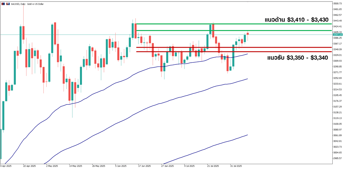 ราคาทองโลกคาดเคลื่อนไหวในกรอบ Sideway ออกข้าง โดยระยะสั้นเกิดสัญญาณ Overbought ในกราฟราย 4 ชั่วโมง จึงคาดมีโอกาสปรับตัวลงจากแรงขายทำกำไร ซึ่งคาดว่ามีแนวรับตามเส้นค่าเฉลี่ยเคลื่อนที่ EMA50 วัน ที่ปรับตัวสูงขึ้นบริเวณ 3,340 และ 3,350 ดอลลาร์ ขณะที่แนวต้านที่ระดับ 3,410 และ 3,430 ดอลลาร์