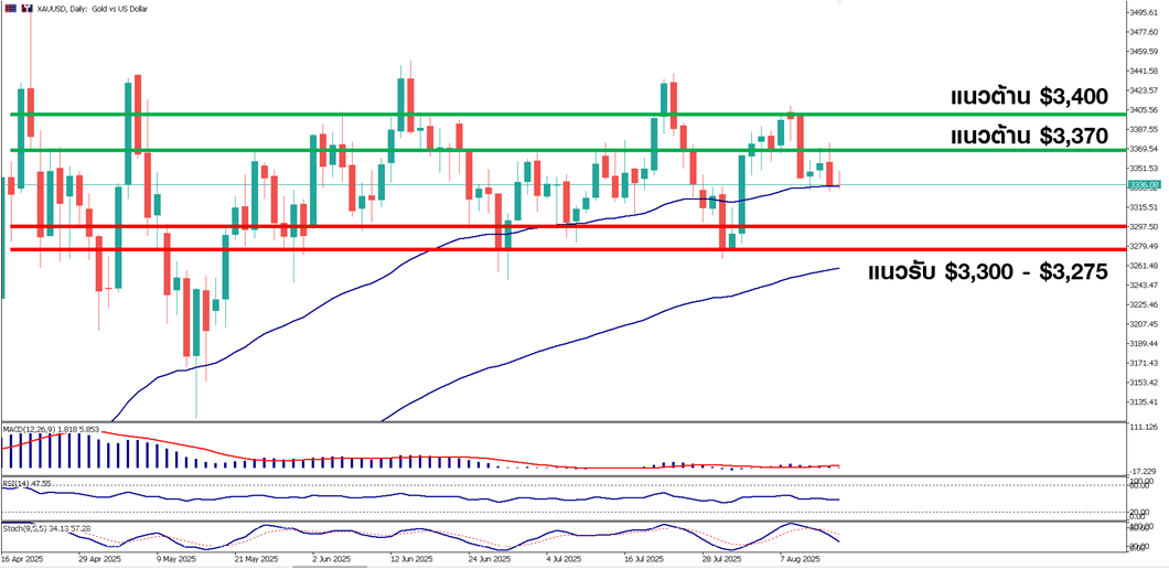 ภาพการเคลื่อนไหวราคาทองโลกในสัปดาห์นี้ คาดมีโอกาสปรับตัวลงต่อ ระยะสั้นแม้ว่าอาจมีโอกาสเกิด Technical Rebound ในสัปดาห์ แต่มีแนวต้านที่ค่อนข้างจำกัดที่ 3,370 และ 3,400 ดอลลาร์ ขณะเดียวกันการปรับตัวลงในสัปดาห์ที่แล้วแม้จะยังรักษาแนวรับตามเส้นค่าเฉลี่ยเคลื่อนที่ EMA50 วัน บริเวณ 3,335 ดอลลาร์ ได้ก็ตาม แต่ยังต้องระวังแรงเทขายจากสัญญาณการพักตัวใน MACD และ Stochastic Oscillators ที่ยังมีลักษณะอ่อนตัวต่อเนื่อง ซึ่งการปรับตัวลงคาดมีโอกาสทดสอบแนวรับจิดวิทยาที่ 3,300 ดอลลาณ์ และถัดไป 3,275 ดอลลาร์