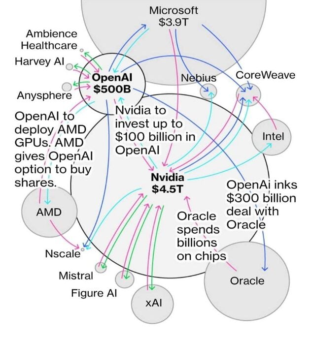 ในปัจจุบัน ความกังวลของตลาดเกี่ยวกับภาวะฟองสบู่ AI ในสินทรัพย์หลักอย่างตลาดหุ้นกำลังก่อตัวขึ้น โดยนาย Michael Burry นักลงทุนชื่อดังที่ได้รับสมญานามว่า The Big Short ในสมัยวิกฤติซับไพรม์เมื่อปี 2008 ได้ออกมากล่าวว่า บริษัทเทคโนโลยียักษ์ใหญ่สหรัฐฯ ได้มีการลงทุนไขว้กับสลับไปมาในระบบนิเวศของอุตสาหกรรม AI เพื่อทำให้งบแสดงฐานะทางการเงิน และ งบกำไรขาดทุนดูดีเกินกว่าความเป็นจริง อาทิเช่นเมื่อ Microsoft ทุ่มเงินลงทุนมหาศาลหลายพันล้านดอลลาร์ให้กับสตาร์ทอัพด้านปัญญาประดิษฐ์อย่าง OpenAI (ผู้พัฒนา ChatGPT) ซึ่ง OpenAI ก็นำเงินลงทุนที่ได้รับนั้นไปซื้อบริการ Cloud Computing (Azure) จาก Microsoft และ/หรือ ซื้อชิปประมวลผล AI จาก Nvidia Microsoft เมื่อได้รับรายได้จาก Azure ก็จะนำไป “ขยายโครงสร้างพื้นฐาน” ด้าน AI ของตนเอง ซึ่งรวมถึงการสั่งซื้อชิปจาก Nvidia จำนวนมหาศาล เพื่อรองรับความต้องการของ OpenAI และลูกค้า AI อื่นๆ ซึ่งจากกลไกนี้ ทำให้ปริมาณเงินยังคงวนเวียนอยู่ภายในระบบนิเวศของบริษัททั้งสาม ได้แก่ OpenAI, Microsoft และ Nvidia นั่นเอง โดยหากจะให้มองในมุมมองทั้งหมด จะสามารถแสดงภาพออกมาได้ดังนี้