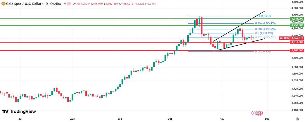 ราคาทองคำโลกในสัปดาห์นี้คาดว่าในทางเทคนิคยังคงทรงตัวในกรอบ Expanding Triangle ซึ่งเป็นการสะท้อนถึงภาวะ “Sideway Up” หลังจากที่ตลาดได้เริ่มมีความกังวลฟองสบู่ AI และเช็คช่วยชาติสหรัฐฯ ที่อาจส่งผลให้เกิดภาวะเงินเฟ้อ อีกทั้งกรรมการเฟดบางส่วนได้มีมุมมองในการลดดอกเบี้ย 0.25% ในเดือนธ.ค. อาจส่งผลให้ทองคำปรับตัวขึ้นทดสอบแนวต้านสำคัญที่ 4,250 และ 4,345 ดอลลาร์ ซึ่งอาจกระตุ้นให้ตลาดมีการปรับตัวขึ้นอย่างต่อเนื่อง อย่างไรก็ตามหากตลาดรับรู้ปัจจัยลบจากกรรมการเฟดส่วนใหญ่มีมติตรึงดอกเบี้ย และการขาดดุลการค้าที่ลดลงซึ่งอาจส่งผลให้ภาวการณ์คลังของสหรัฐฯ เริ่มมีเสถียรภาพมากขึ้น ก็อาจทำให้ทองคำปรับตัวลงทดสอบแนวรับสำคัญที่ 4,010 และ 3,900 ดอลลาร์ ซึ่งอาจกระตุ้นแรงขายในตลาดทองคำในรอบใหม่ได้เช่นกัน